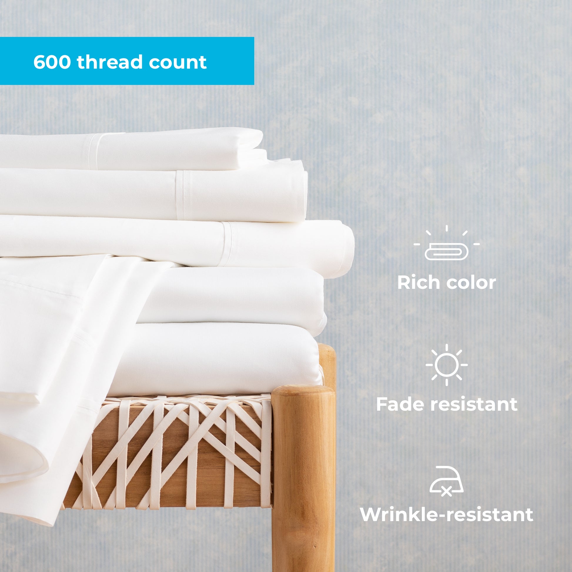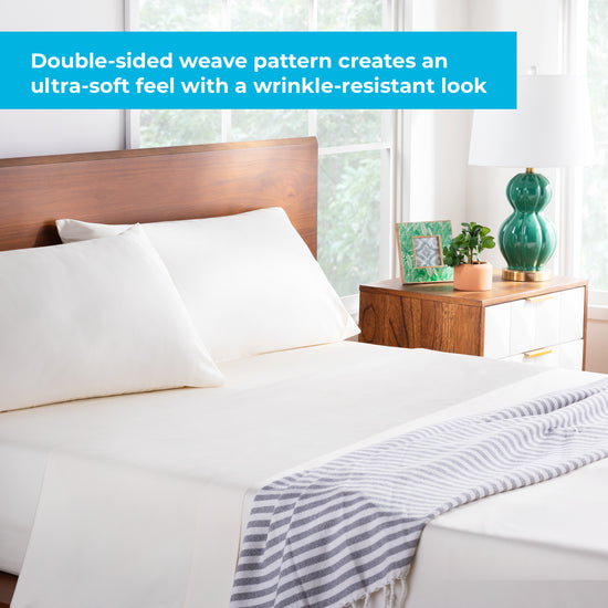 Designed for optimal comfort and convenience, this sheet set ain’t messing around. The unique weave pattern creates a super soft and cozy cotton feel against your skin with a wrinkle and fade resistant polyester top side.