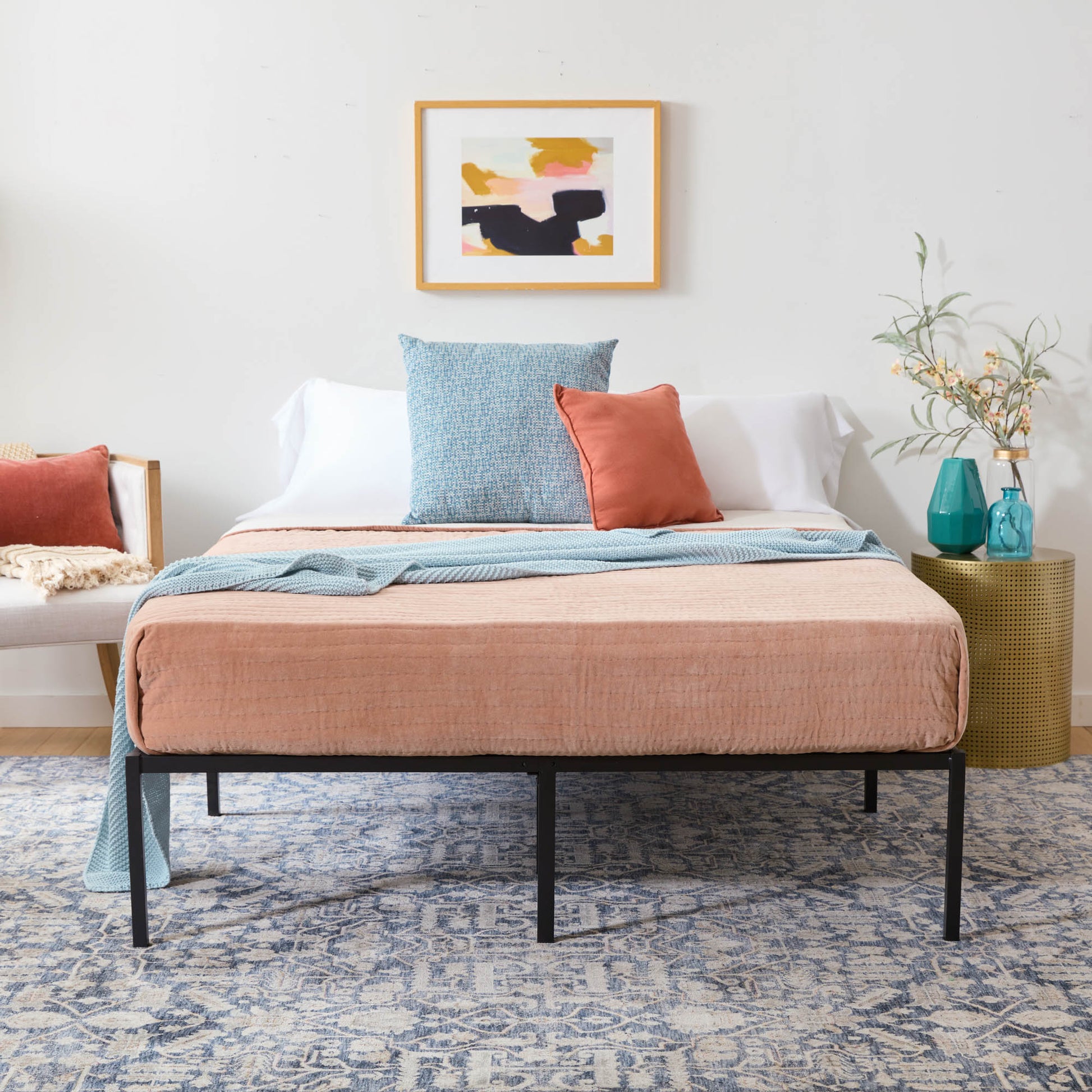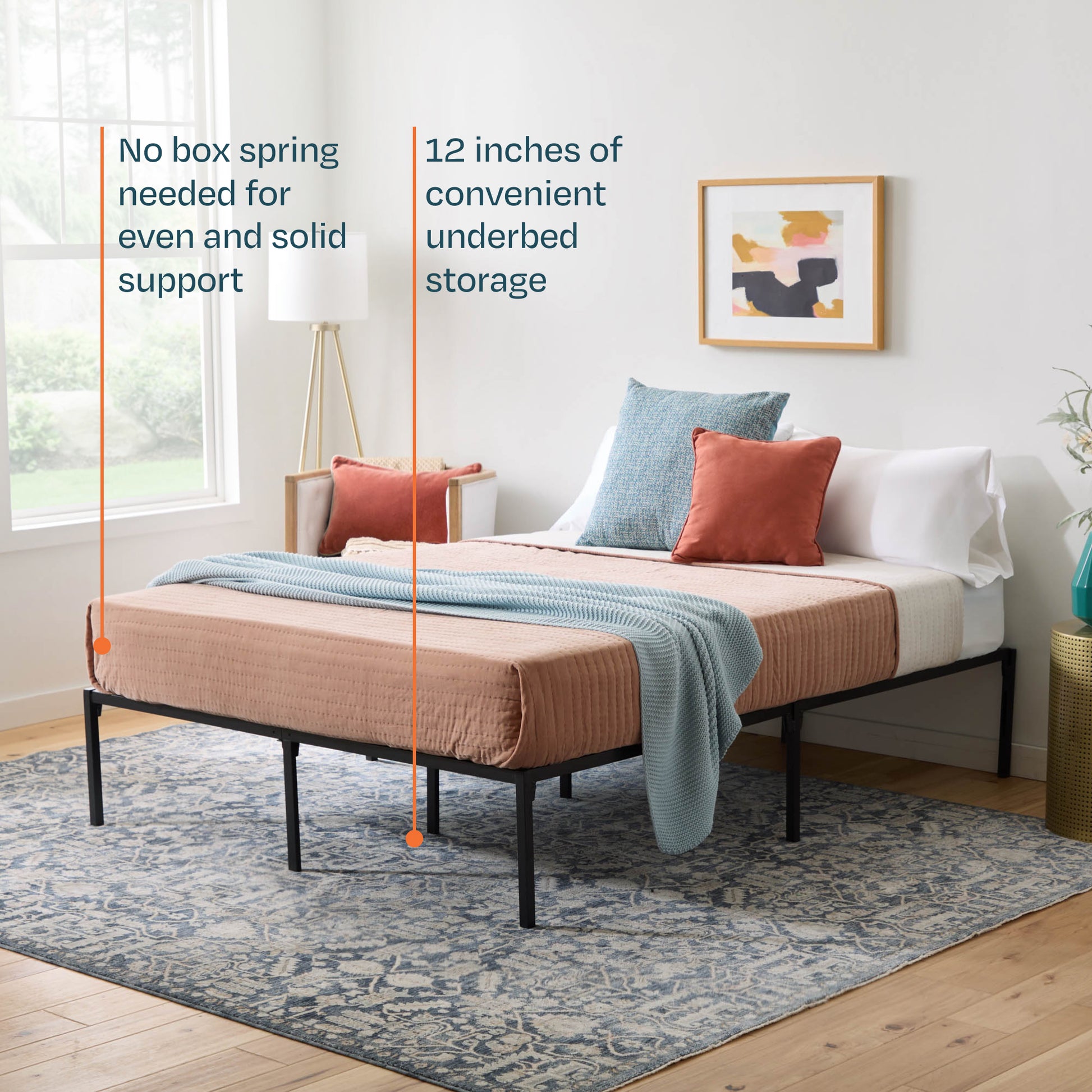 Make big moves with this heavy duty metal platform bed frame. Designed to go in any room and accommodate any guest without a second thought, this bed frame provides reliable support and doesn’t look half bad doing it. Just dress it up with a headboard for a truly elevated look.