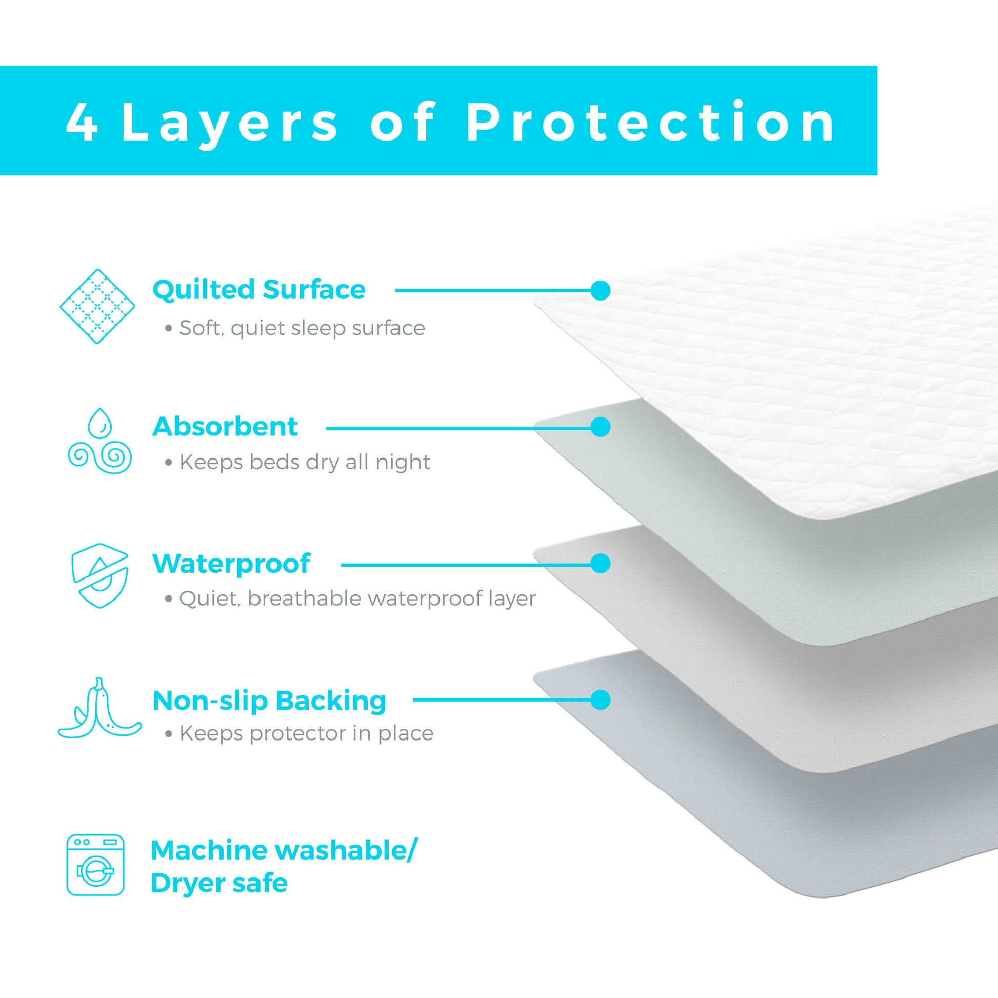Protect your sheets and mattress from accidents with a layer of soft, quiet, waterproof protection. A polyester/cotton cover and thin, absorbent layer of down alternative fill are quilted to create a protective layer that doesn't change the feel of the sleep surface. Highly absorbent and waterproof, this pad is great for incontinence issues, or for children who experience bed wetting. Its easy removal and care mean no more middle-of-the-night bedding changes. Easy care pad is machine washable and dryer safe